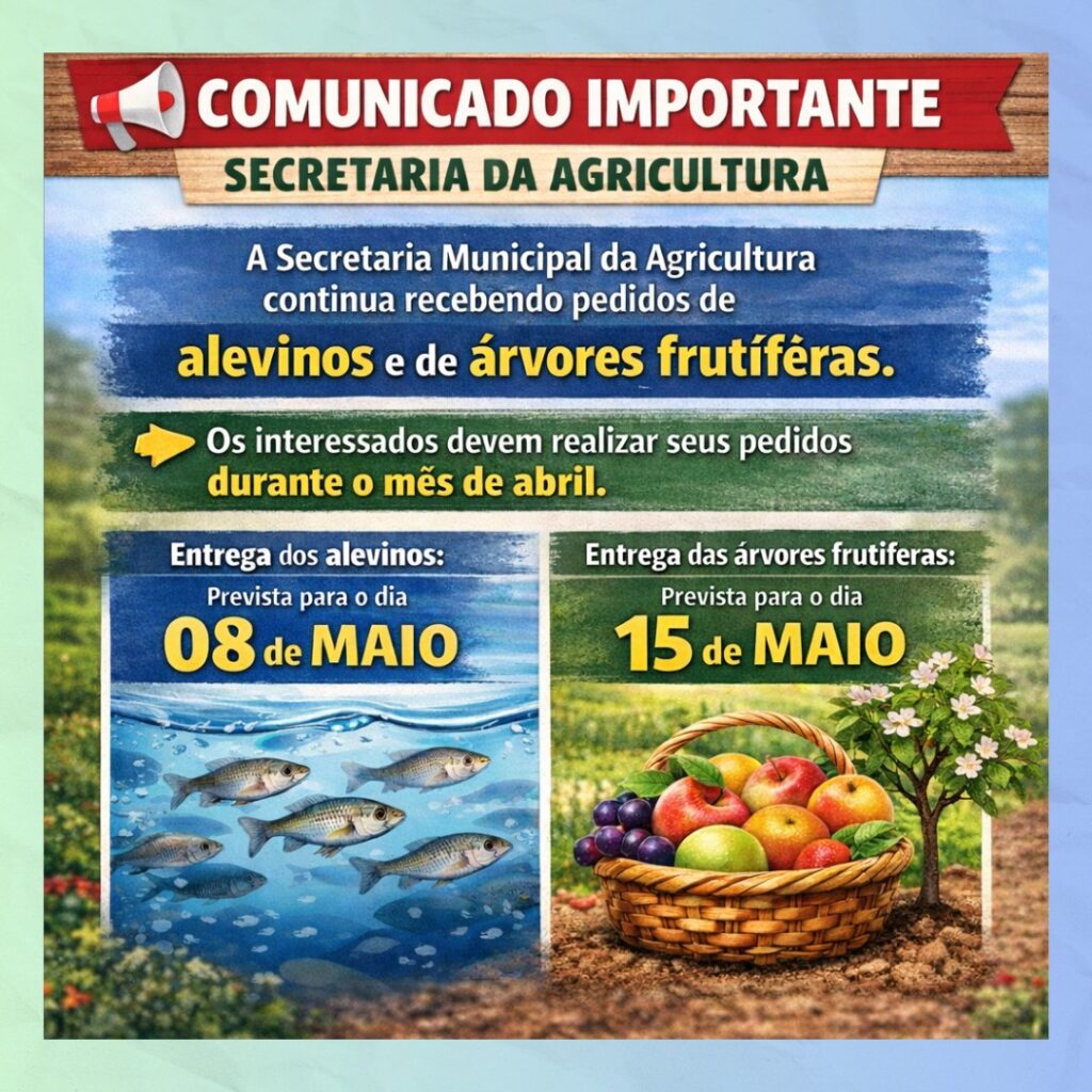 A entrega dos alevinos está prevista para o dia 8 de maio, enquanto as mudas de árvores frutíferas serão distribuídas no dia 15 de maio.