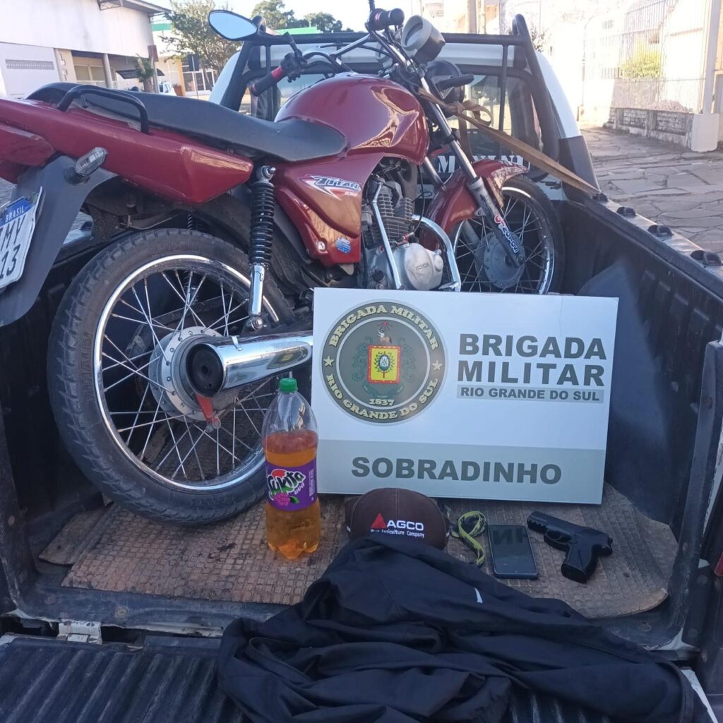 A dupla estava em posse da motocicleta furtada e, durante a abordagem, também foi localizado um simulacro de arma de fogo.
