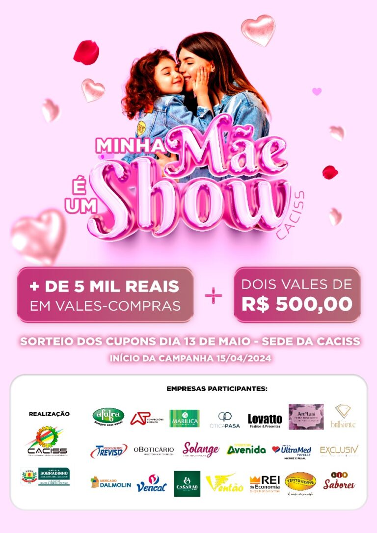 A Caciss de Sobradinho, vai promover a Campanha “Minha Mãe é Um Show” em alusão a uma das datas mais importantes para o comércio local, o Dia das Mães. A Campanha será lançada segunda-feira (15), na sede da entidade. A Campanha acontece entre os dias 15 de abril a 13 de maio com o objetivo de reunir 21 empresas associadas à Caciss, onde cada uma delas irá sortear um vale-compra no valor de R$ 250,00 entre seus clientes que comprarem no período de vigência da Campanha.