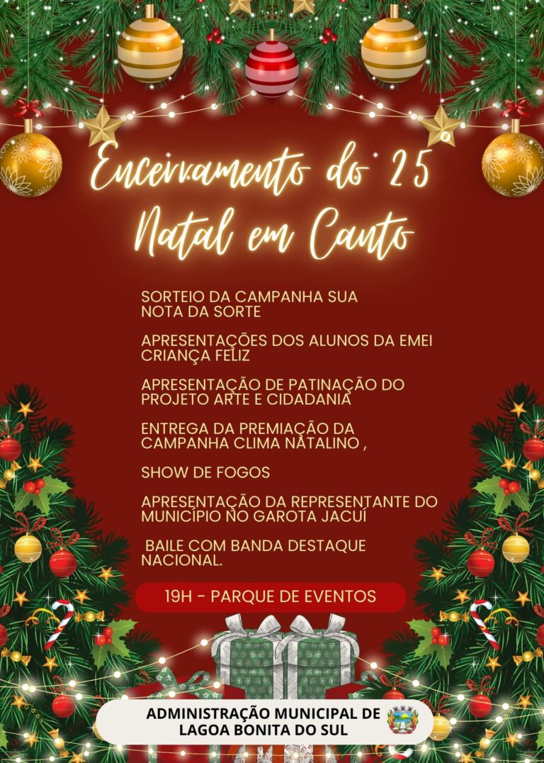 As festividades do 25° Natal em Canto de Lagoa Bonita do Sul, encerram nesta sexta-feira (20), no Parque Municipal de Eventos. A programação abre logo mais às 19 horas, com o sorteio da Campanha Sua Nota da Sorte, seguida da entrega da premiação da Campanha Clima Natalino onde todas as famílias e estabelecimentos comerciais inscritos serão premiados. Depois haverá apresentações dos alunos da EMEI Criança feliz, apresentação do grupo de patinação do projeto Arte e Cidadania, show de fogos e baile animado pela Banda Destaque Nacional.