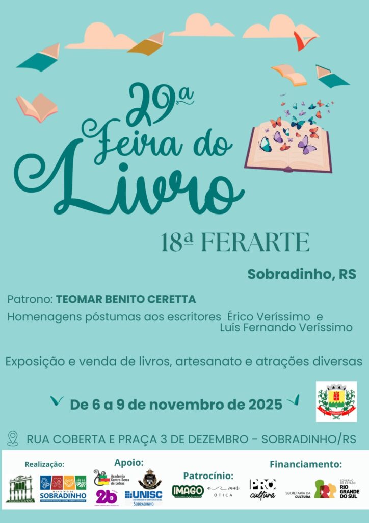Mais de 60 expositores participam do evento, que terá lançamentos de livros, sessões de autógrafos, apresentações artísticas e culturais, além de Torneio Regional de Xadrez e entrega de premiações do Concurso Literário Jornalista Valacir Cremonese, do Troféu Semeador Cultural e do Prêmio Boas Práticas na Educação. A 29ª Feira do Livro e a 18ª FERARTE de Sobradinho são promovidas pela Prefeitura, com financiamento do Pró-Cultura RS, apoio do Conselho Municipal de Políticas Culturais, Academia Centro Serra de Letras, UNISC, 2B Telecom, Centro Serra Xadrez Clube, e patrocínio da Ótica Amar e Imago Informática e Papelaria.