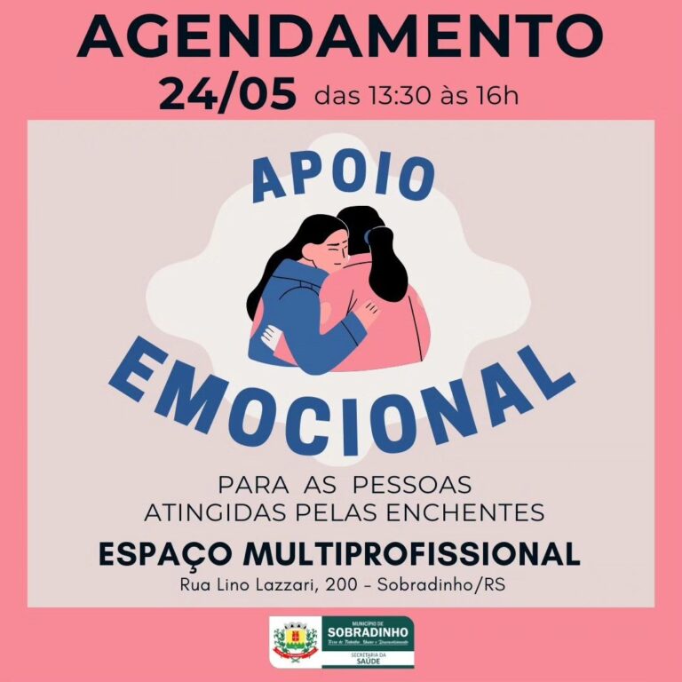 A Secretaria Municipal da Saúde de Sobradinho, através das psicólogas e da facilitadora de Artes do Espaço Multiprofissional, estará desenvolvendo o projeto Apoio Emocional para as pessoas que foram atingidas pela enchente, que ocorreu no município no final do mês de abril e início de maio. Nesta sexta-feira (24), serão feitos os agendamentos presenciais para esses atendimentos.