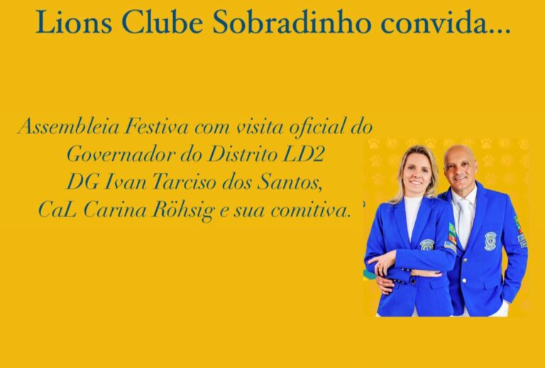 O Lions Clube de Sobradinho promove assembleia festiva nesta sexta-feira (18), a partir das 20 horas na sede da AABB. Na ocasião, estará presente em visita oficial, o governador do Distrito LD-2, Ivan Tarciso dos Santos, e sua comitiva.