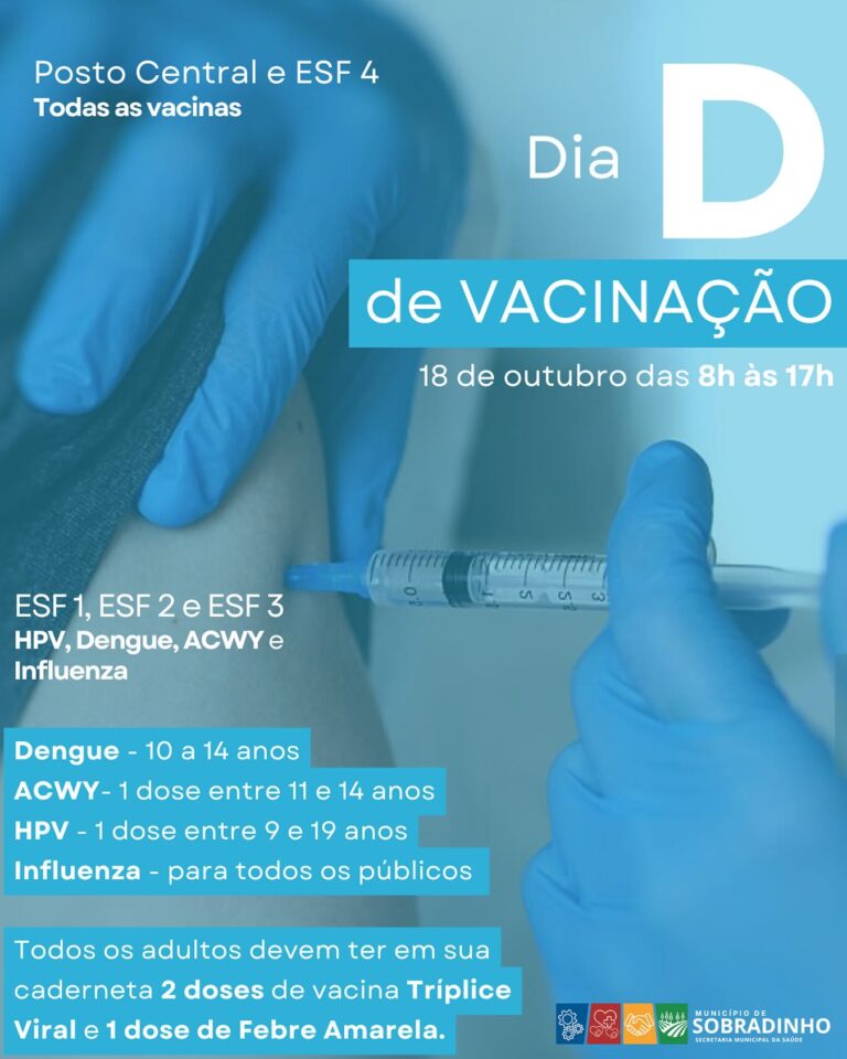 A Secretaria Municipal da Saúde de Sobradinho promoverá no sábado, dia 18 de outubro, o Dia D de Vacinação, com atendimento das 8h às 17h. A ação tem como objetivo ampliar a cobertura vacinal e atualizar as carteiras de crianças, adolescentes e adultos. Na ESF 4 e no Posto Central estarão disponíveis todas as vacinas do calendário nacional de imunização. Na ESF 1, ESF 2 e ESF 3: vacinas contra HPV, Dengue, ACWY e Influenza.