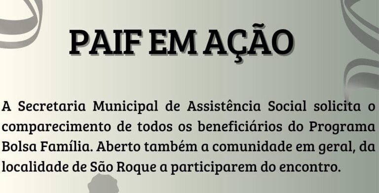 A Secretaria Municipal de Assistência Social, por meio do CRAS, promove nesta quarta-feira (22), encontros do PAIF em Ação para os beneficiários do Programa Bolsa Família e demais pessoas da comunidade.
