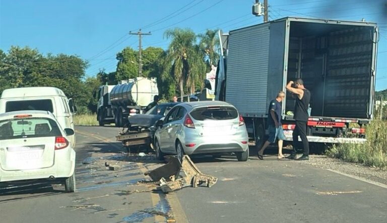 Três pessoas ficaram feridas em um acidente que envolveu cinco veículos na manhã desta terça-feira, 11, na RSC 481, em Linha Rocinha, Arroio do Tigre. De acordo com as primeiras informações, o caminhão baú estava estacionado no estreito acostamento da rodovia. O trânsito chegou a ficar totalmente interrompido até a remoção dos feridos. Posteriormente, foi liberado em meia pista.