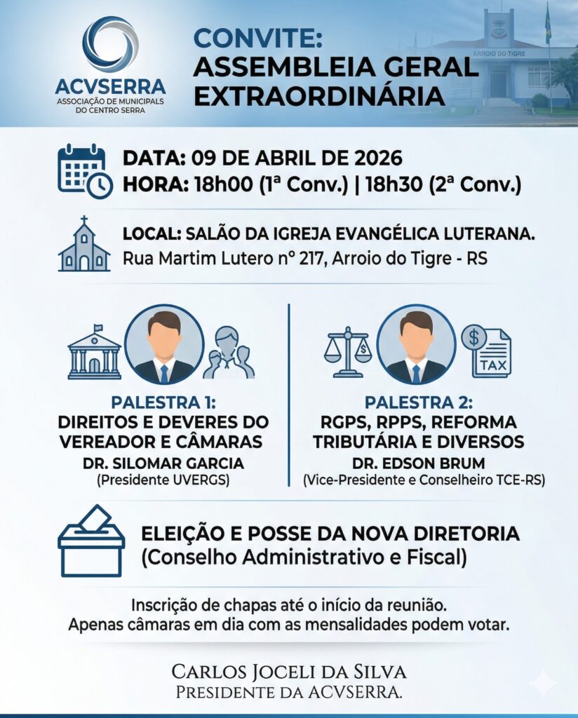 A Associação das Câmaras de Vereadores do Centro Serra promoverá uma Assembleia Geral Extraordinária nesta quinta-feira (09), no Salão da Igreja Evangélica de Confissão Luterana no Brasil, em Arroio do Tigre.