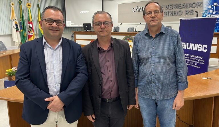 O vice-prefeito e atual secretário de Educação, Cultura, Turismo e Desporto, Ivan Trevisan, e os secretários municipais da Agricultura e Meio Ambiente, Jair Cremonese, e da Indústria, Comércio e Serviços, Darlan Kittel, participaram da aula inaugural do curso Técnico em Agropecuária da Unisc – campus de Sobradinho, realizada na Câmara de Vereadores.