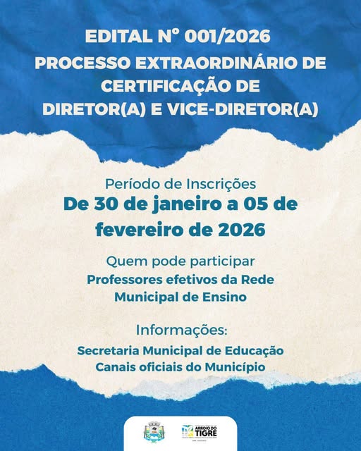 A Administração Municipal publicou no Diário Oficial o edital do Processo Extraordinário de Certificação para os cargos de Diretor(a) e Vice-Diretor(a) do Sistema Municipal de Ensino. A iniciativa é promovida pela Secretaria de Educação de Arroio do Tigre. As inscrições abriram nesta sexta-feira (30) e poderão ser feitas até o dia 5 de fevereiro.