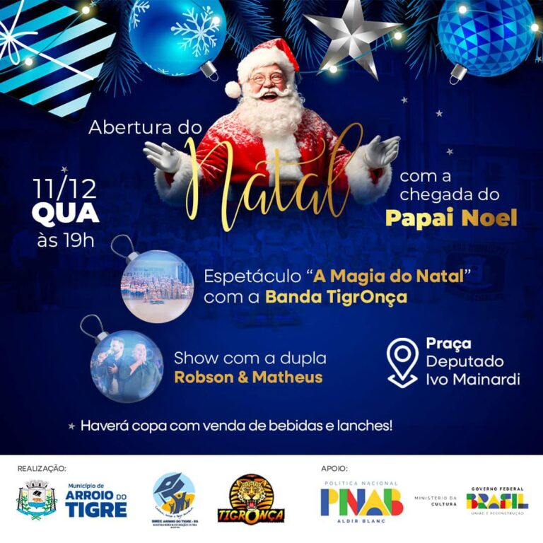 A Administração Municipal de Arroio do promove nesta quarta-feira (11), a abertura oficial das festividades do Natal 2024. O evento será logo mais às 19h, na Praça Deputado Ivo Mainardi. Na ocasião, haverá a chegada especial do Papai Noel e apresentação do espetáculo “A Magia do Natal”, apresentado pela Banda TigrOnça, seguido de um show com a dupla Robson & Matheus.