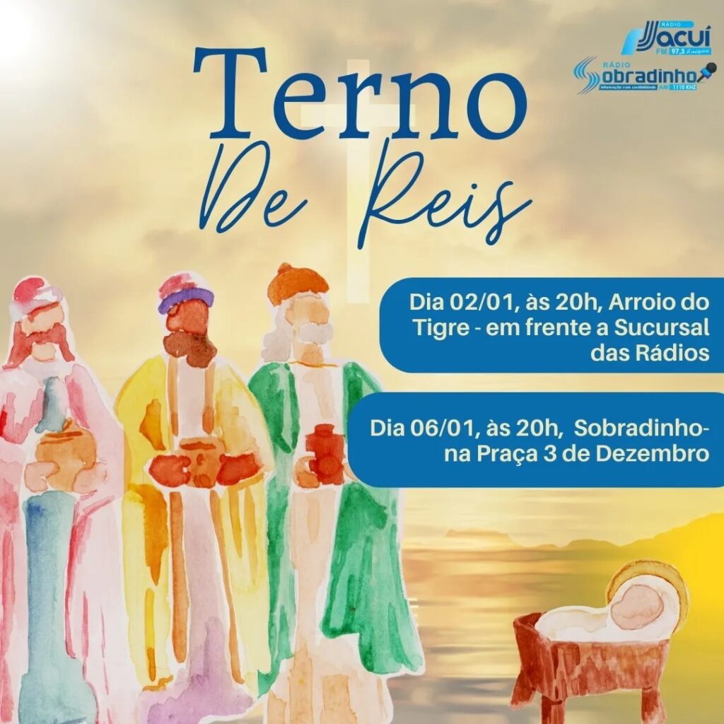 Nesta terça-feira, Arroio do Tigre receberá a tradicional manifestação religiosa e cultural do Terno de Reis. O evento terá início às 20h, em frente à sucursal da Rádio Sobradinho, e contará com a apresentação de talentos locais para a comunidade. O Terno de Reis é uma tradição que recorda a visita dos três reis magos ao Menino Jesus, logo após o seu nascimento. Gaspar, Baltazar e Belchior ofereceram presentes simbólicos, como ouro, incenso e mirra, representando a realeza e a universalidade da salvação trazida por Jesus. Também, a tradição cristã afirma que os três homens são de cores e culturas distintas, simbolizando assim a universalidade da salvação, trazida a todos os povos e não somente aos judeus.