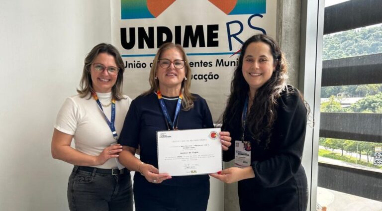 A secretária municipal de Educação e Cultura de Arroio do Tigre, Vilma Telöken, acompanhada da supervisora dos anos iniciais e articuladora do município, Raquel de Castro Fiuza Neuenfeldt, recebeu na tarde dessa quarta-feira (02), o certificado referente ao Selo Compromisso com a Alfabetização, na categoria prata. A entrega foi feita pela articuladora estadual e representante da Undime no programa Compromisso Nacional Criança Alfabetizada, Driele Severo.