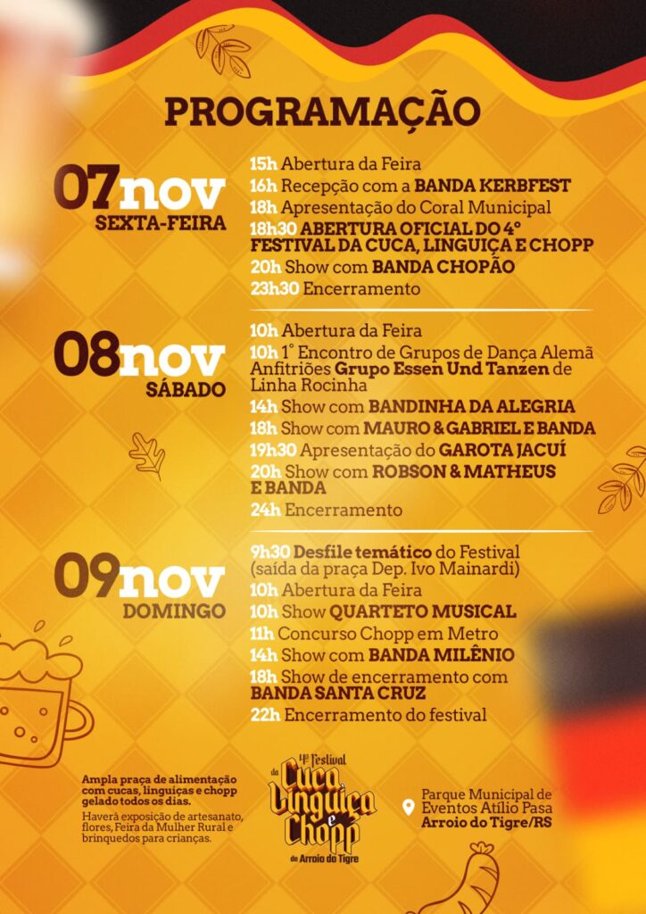 Vem aí o 4º Festival da Cuca, Linguiça e Chopp de Arroio do Tigre! O evento acontece nos dias 7, 8 e 9 de novembro, no Parque Municipal de Eventos Atílio Pasa. A programação inicia na sexta-feira, dia 7, com a abertura da feira às 15 horas. Na sequência, recepção com a Banda Kerbfest, seguida de apresentação do Coral Municipal. A abertura oficial do festival ocorre às 18 horas e 30 minutos, e a noite encerra com show da Banda Chopão.