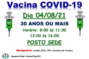 A Secretaria de Saúde de Arroio do Tigre continua avançando na vacinação contra a Covid-19. Nesta quarta-feira, 4, serão vacinadas as pessoas com 30 anos ou mais, no Posto de Saúde Sede, das 8h às 11h e das 13h às 16h.
