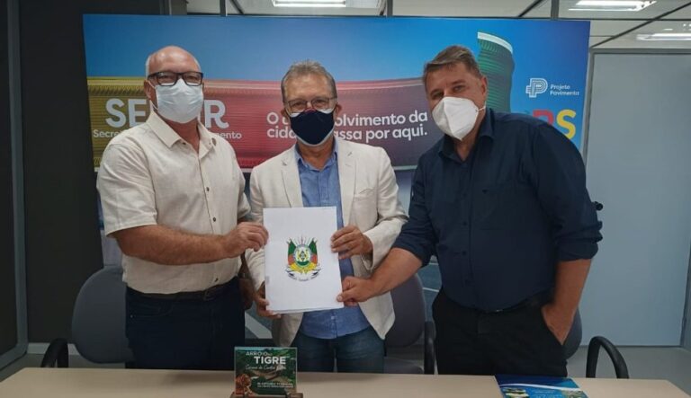 O prefeito de Arroio do Tigre, Marciano Ravanello, acompanhado do diretor de projetos, Flamir Schneider, esteve em Porto Alegre nessa quinta-feira (13), onde assinou o convênio para recebimento dos recursos que serão usados na pavimentação e construção da ciclovia na Rua Getúlio Vargas. O ato ocorreu na Secretaria de Desenvolvimento Urbano e Metropolitano (Sedur) e contou com a presença do secretário Luiz Carlos Busato.