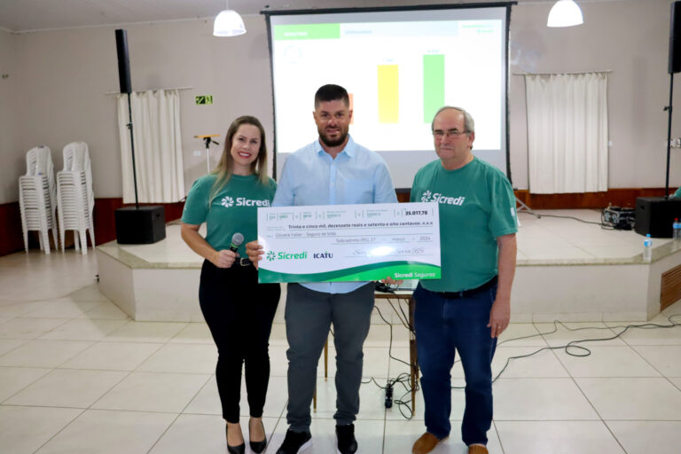 A agência da Sicredi de Sobradinho promoveu na última quarta-feira, dia 27, a entrega do prêmio Seguro de Vida para o associado Gilvane Faller, que foi contemplado com R$ 34 mil. A solenidade ocorreu durante a Assembleia de Núcleo, realizada no Salão Paroquial Católico. Durante o evento, o sobradinhense recebeu do vice-presidente da cooperativa Ciro Bavaresco, e da gerente da agência local, Sabrina Finkler Dal Ri, o cheque simbólico do valor contemplado. Morador do interior do município, Gilvane foi o primeiro sorteado da cooperativa em 2024.