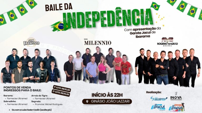 O Baile da Independência será dia 6 de setembro, véspera de feriado, no ginásio João Lazzari, em Ibarama, a partir das 22 horas. Destaque para a Banda San Francisco, que abre a programação da noite, seguida pela Banda Milennio, e encerrando a noite com Rogério Magrão e Banda. Os ingressos antecipados podem ser adquiridos nas farmácias Ultramed de Ibarama; Sobradinho e Arroio do Tigre. No município de Segredo com a Promoter Micheli Rodrigues, e ainda com Luiza Soder Ceolin, em Sobradinho.