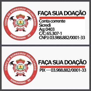Neri Carlos Manske também lembra que atualmente, os Bombeiros de Sobradinho estão com uma das viaturas de combate a incêndios em processo de reforma, e sempre são necessários recursos complementares. O grupo pretende ainda, se possível, fazer a instalação de guinchos frontais nos caminhões para auxiliar nos resgates. Para quem desejar fazer doações para os Bombeiros Voluntários de Sobradinho podem fazê-las na conta Sicredi: Agência 0403 – Conta Corrente 65307-1; CNPJ 03.988.882/0001-33, número esse, que também é o PIX dos Bombeiros de Sobradinho.