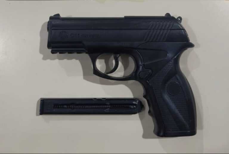 No local, um dos homens foi abordado e, durante a revista pessoal, os policiais localizaram um simulacro de arma de fogo em sua cintura. Diante dos fatos, o homem foi preso e encaminhado à Delegacia de Polícia para o registro da ocorrência.