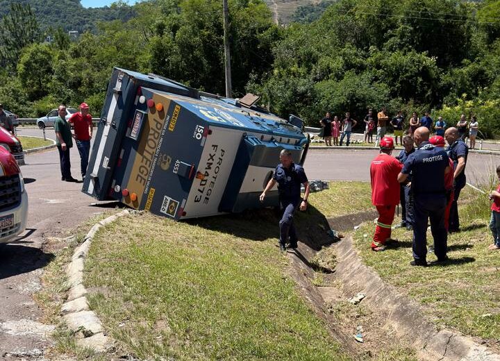 Um acidente de trânsito envolvendo um caminhão e um veículo de transporte de valores foi registrado na manhã desta quinta-feira (18), no trevo da FEJÃO, em Sobradinho. Com a colisão entre os veículos, o carro-forte acabou tombando no local.