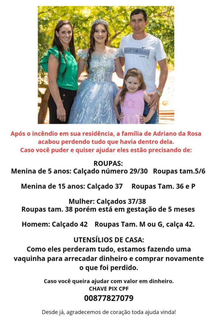 Diante da situação, amigos e moradores se mobilizaram para arrecadar doações de roupas, calçados e utensílios domésticos. Entre as principais necessidades estão itens para uma menina de 5 anos, uma adolescente de 15 anos, uma mulher — que está grávida de cinco meses — e um homem, além de móveis e objetos básicos para a casa.