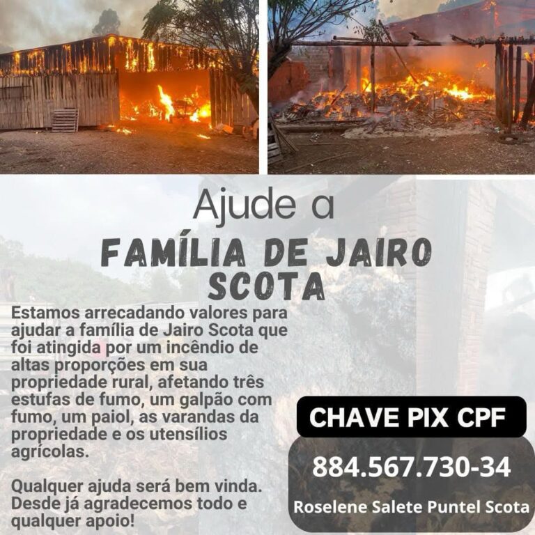 Uma campanha solidária está em andamento para ajudar a família de Jairo Scota, após um incêndio de grandes proporções atingir sua propriedade rural na localidade de Linha Salete, interior de Ibarama. O fogo começou na manhã da última terça-feira, dia 18 de fevereiro, por volta das 5 horas, e se espalhou rapidamente, destruindo três estufas de fumo, um galpão, um paiol e as varandas da propriedade. Equipamentos como carroça, esteira e motosserra foram consumidos pelas chamas, além de mais de mil arrobas de fumo estocadas, incluindo quatro fornadas que estavam na varanda. Jairo Scota, no dia do ocorrido, também lamentou a perda da estrutura do galpão, que era nova.