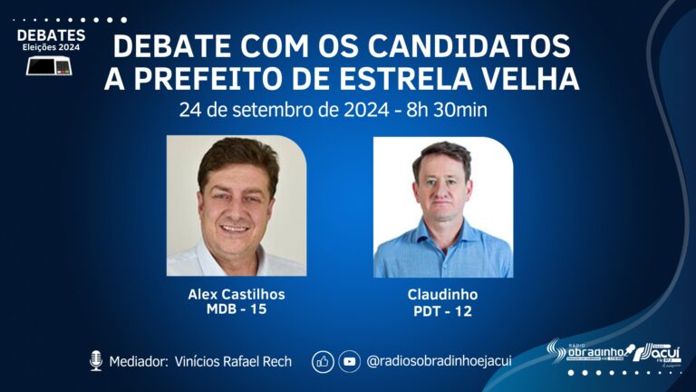 A Rádio Sobradinho dá sequência à série de debates eleitorais nesta terça-feira (24) com os candidatos de Estrela Velha. Alexander Castilhos (MDB) e Cláudio Puntel dos Santos (PDT) disputam o Passo Municipal e vão debater acerca das ideias e propostas para o município. O debate inicia às 8h30 e será transmitida em rede pelas rádios Sobradinho e Jacuí, além das redes sociais como Facebook e Youtube também com imagens.