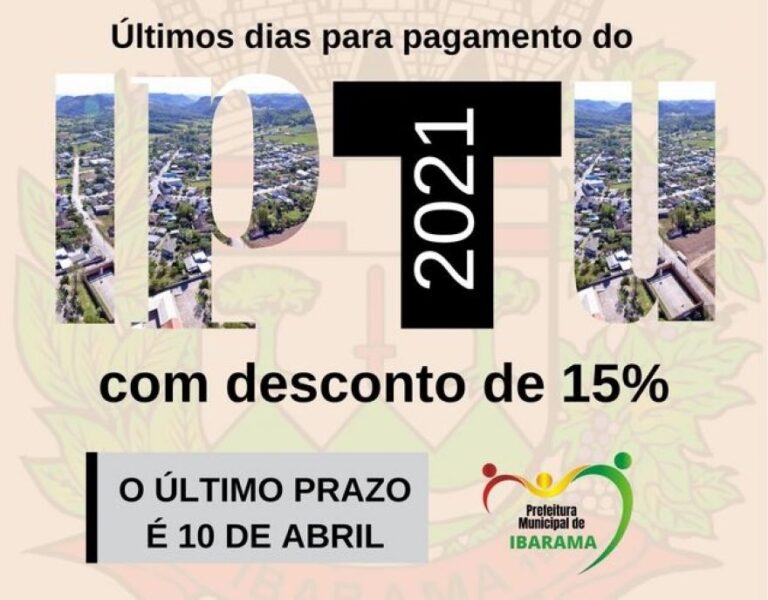 A Secretaria de Finanças de Ibarama, informa os contribuintes que os carnês, para pagamento do IPTU 2021, estão disponíveis no Setor de Tributos, junto à Prefeitura Municipal.  O último prazo para pagamento com desconto de 15% é dia 10 de abril.