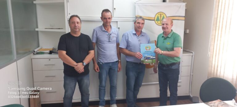 O prefeito de Lagoa Bonita do Sul, Luiz Francisco Fagundes, e o presidente da Associação de Poço Artesiano de Linha Alta, Nereu Silveira, estiveram reunidos, em Cachoeira do Sul, com representantes da CELETRO, incluindo o presidente Bertino Rech e o gerente de Relações Institucionais, Edson Moraes.