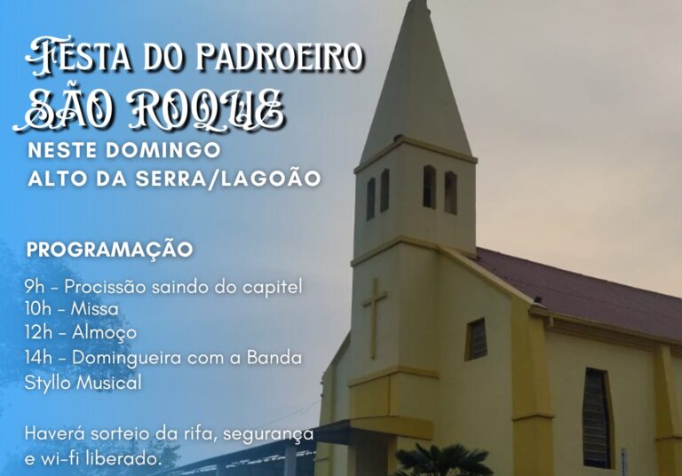 A Comunidade São Roque de Alto da Serra – Lagoão promove festa neste domingo (18), para homenagear seu padroeiro. A programação começa às 9 horas com procissão saindo do capitel em direção a Igreja. Às 10 horas missa; ao meio dia almoço festivo com churrasco de gado e porco, linguiça campeira e galinha assada e recheada, além de saladas e cucas.