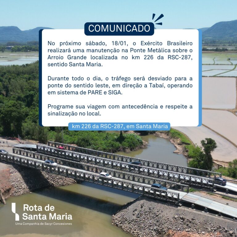 A Concessionara Rota de Santa Maria, do Grupo Sacyr, promoverá neste sábado (18), obras de manutenção na Ponte Metálica sobre o Arroio Grande, no km 226 da RSC-287, sentido Paraíso do Sul/Santa Maria.