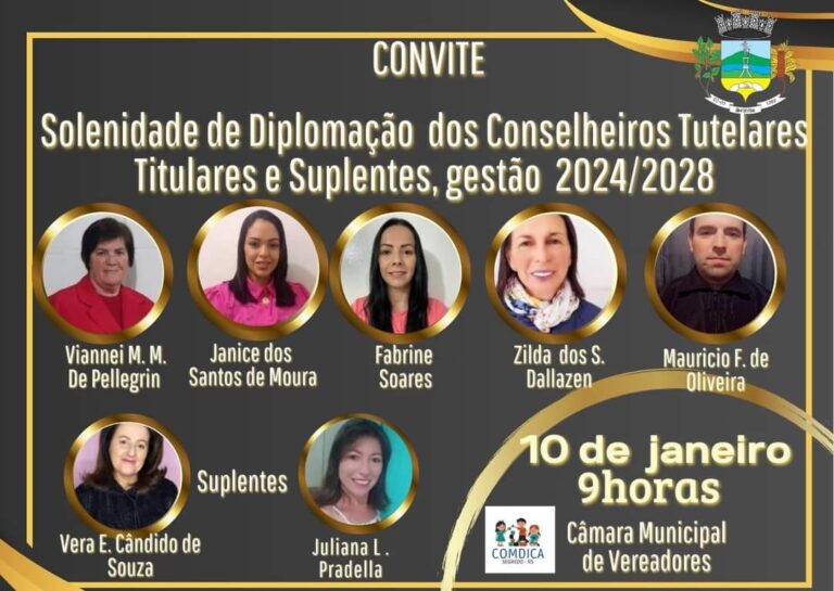 A diplomação dos conselheiros é um momento de reconhecimento e valorização desses profissionais comprometidos com a defesa dos direitos, além de estabelecer o compromisso de uma gestão competente e comprometida com a causa. Portanto, toda população está convidada a participar desta solenidade, que acontecerá na quarta-feira, dia 10 de janeiro, às 9 horas, na Câmara de Vereadores.