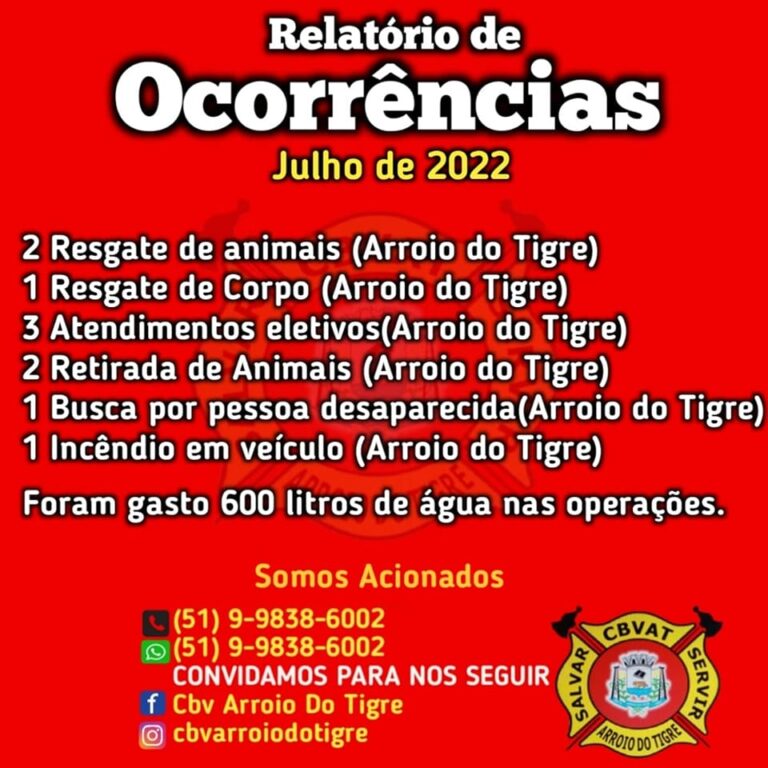 No último domingo, 31 de julho, o Corpo de Bombeiros Voluntários de Arroio do Tigre publicou em suas redes sociais um relatório que contabiliza todas as ocorrências efetuadas durante o mês.