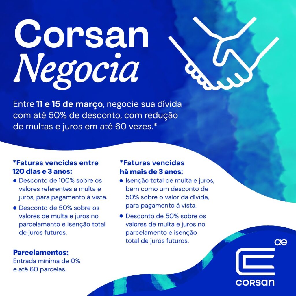 A Corsan Aegea promoverá nova campanha de incentivo à quitação de débitos. Será no período de 11 a 15 de março para os consumidores dos 317 municípios atendidos pela Companhia no Estado. O programa tem o objetivo de facilitar a regularização de dívidas de consumo dos serviços de água e esgoto com descontos que chegam a 50% do valor original de faturas vencidas ou a até 100% dos juros e/ou multas aplicados, além de condições especiais de parcelamento em até 60 vezes, sem entrada.