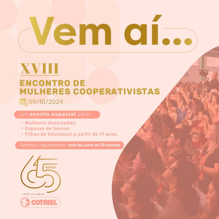 O 18º Encontro de Mulheres da Cotriel será dia 9 de outubro, na sede da Afeco, em Espumoso. A abertura será às 9h30min com pronunciamento do presidente da COTRIEL. Às 10 horas – palestra: O equilíbrio das emoções e a Força do recomeço, com o escritor e terapeuta, Gabriel Carneiro Costa. Após o almoço, às 13h30min – show com a dupla Paula e Pâmela. Às 15 horas – sorteio de 10 viagens para o Rio de Janeiro. O encerramento do encontro está previsto para ocorrer às 15h30min.