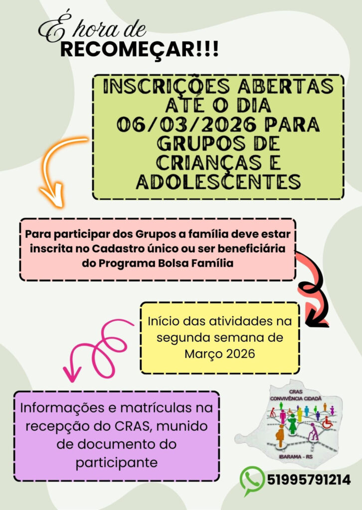 A iniciativa tem como objetivo promover atividades socioeducativas, fortalecer vínculos familiares e comunitários, além de incentivar o desenvolvimento social dos participantes. As atividades estão previstas para iniciar na segunda semana de março de 2026. Mais informações e matrículas podem ser realizadas diretamente na recepção do CRAS de Ibarama, mediante apresentação de documento do participante. O atendimento também está disponível pelo telefone/WhatsApp (51) 9 9579-1214.