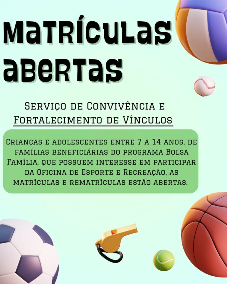A Secretaria Municipal da Assistência Social e o Serviço de Convivência e Fortalecimento de Vínculos, do CRAS Nascer do Sol, estão fazendo as matrículas e rematrículas para as Oficinas de Esporte e Recreação. Podem participar crianças e adolescentes de 7 a 14 anos, de famílias beneficiarias do programa Bolsa Família.