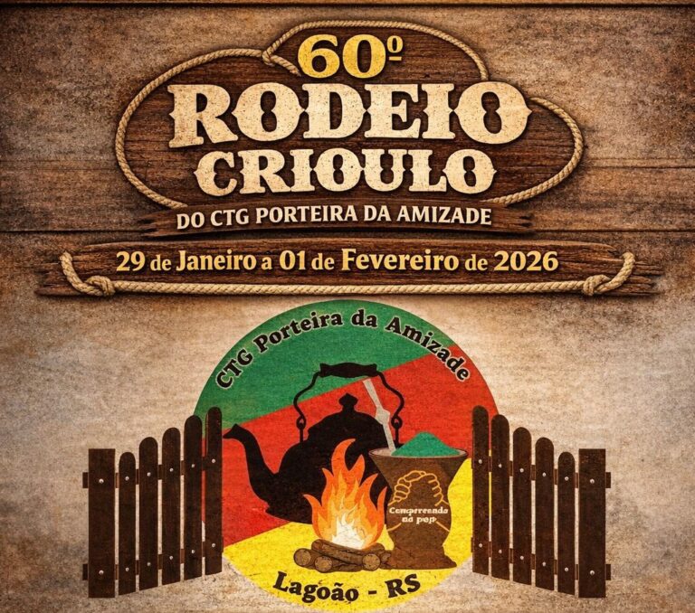 O CTG Porteira da Amizade, de Lagoão, realiza de 29 de janeiro a 1º de fevereiro o 60º Rodeio Crioulo, marcando seis décadas de história e valorização do tradicionalismo gaúcho. Serão quatro dias de intensa programação, com início na quinta-feira e encerramento no domingo.