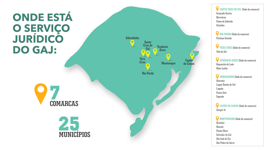 O Gabinete de Assistência Jurídica da Unisc, mais conhecido como GAJ, é um espaço para que os acadêmicos tenham a prática da profissão. A partir do 8º semestre, os estudantes prestam serviço jurídico gratuito à população carente, somando experiência profissional, aprendizagem e colaborando ativamente com a transformação social. Em Santa Cruz do Sul o GAJ atua desde 1977. Hoje também atende as comarcas de Santa Cruz do Sul, Vera Cruz, Rio Pardo, Sobradinho, Venâncio Aires e Capão da Canoa. Neste ano de 2022, com a recente instalação do Curso de Direito em Montenegro, os acadêmicos também estarão iniciando estágios no GAJ da cidade. Somando estas comarcas, que atendem diversas localidades jurisdicionadas, 25 municípios serão beneficiados.