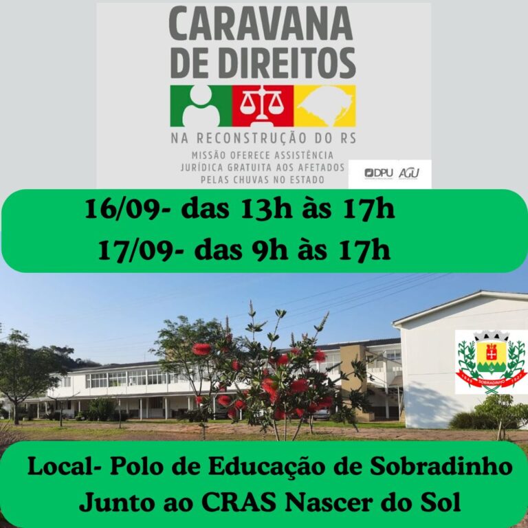 O município de Sobradinho recebe na próxima semana o projeto Caravana de Direitos na Reconstrução do RS, da Defensoria Pública da União, em parceria com outros órgãos, que busca levar assistência jurídica integral e gratuita para a população das cidades atingidas pelas enchentes. Em Sobradinho, a atividade ocorre segunda-feira (16), das 13 às 17hs, e na terça (17), das 9 às 17hs, no Polo Regional de Ensino Superior a Distância de Sobradinho – no Bairro Vera Cruz, junto ao CRAS Nascer do Sol.