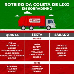 A coleta de lixo no centro de Sobradinho é feita sempre de segunda a sexta de manhã e tarde, e aos sábados pela manhã. Nos Bairros, o serviço é feito em dias alternados. Aos domingos, não há recolhimento de lixo em Sobradinho. Por isso, a equipe de limpeza e o pessoal que faz o recolhimento apelam para que o material seja depositado nas lixeiras somente nos dias em que o recolhimento é feito pela empresa responsável pela coleta. O roteiro completo de recolhimento pode ser conferido abaixo: