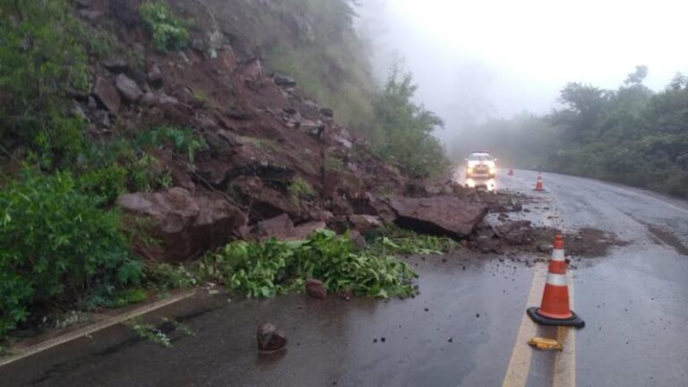 A ERS-400, que liga os municípios de Candelária e Sobradinho, no Vale do Rio Pardo, está parcialmente interrompida por causa de um deslizamento de terra na manhã desta quarta-feira (13). Terra e pedras que desceram da encosta bloquearam um dos lados da rodovia na altura do km 14, cerca de 500 metros de distância da Curva das Cobras, trecho de Candelária.