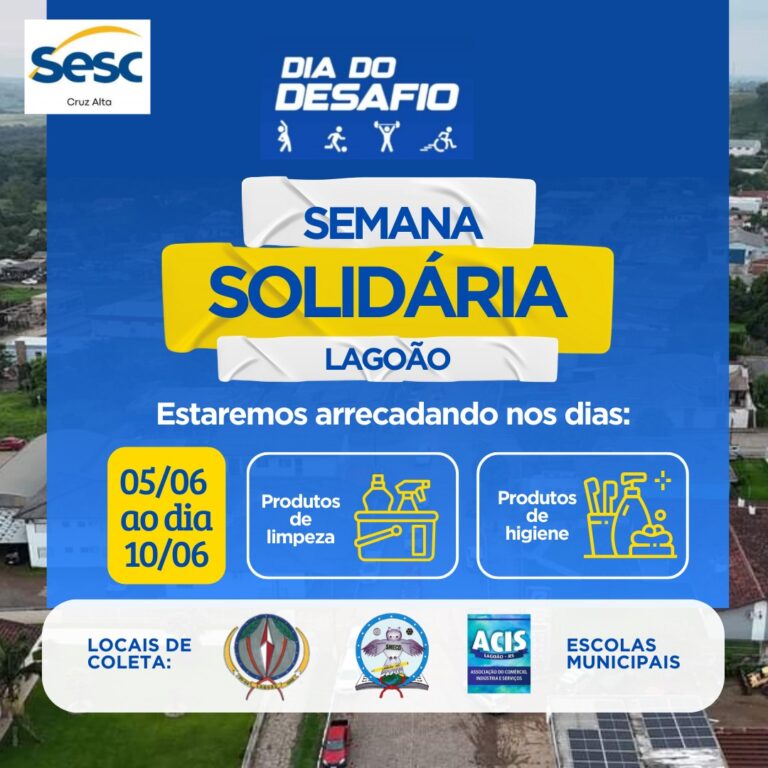 A Secretaria Municipal de Educação, Cultura e Desportos de Lagoão, em parceria com o SESC Cruz Alta, ACIS e Escolas Municipais, vai promover o Dia do Desafio e a Semana Solidária de Lagoão. Este ano o Dia do Desafio inova no seu formato. Ao invés de atividade física será feita arrecadação de produtos de limpeza e higiene pessoal para, a posterior distribuição aos atingidos pelas enchentes do mês passado.