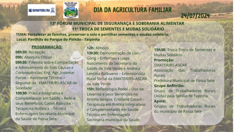 O 13º Fórum Municipal de Segurança e Soberania Alimentar e 11º Dia da Troca de Sementes e Mudas Solidária de Passa Sete será dia 24 de julho, no pavilhão do Parque do Pinhão. A abertura oficial será às 9 horas, seguida de palestra sobre Compactação e Adensamento do Solo – causas e consequências, com o Engenheiro Agrônomo, Josemar Parise, assistente técnico regional da Emater-Ascar. Às 1h30min – palestra sobre Prática Integrativa e Complementar em Saúde: reike e seis benefícios, com Catieli Rabuske – técnica em enfermagem da Secretaria da Saúde de Passa Sete.