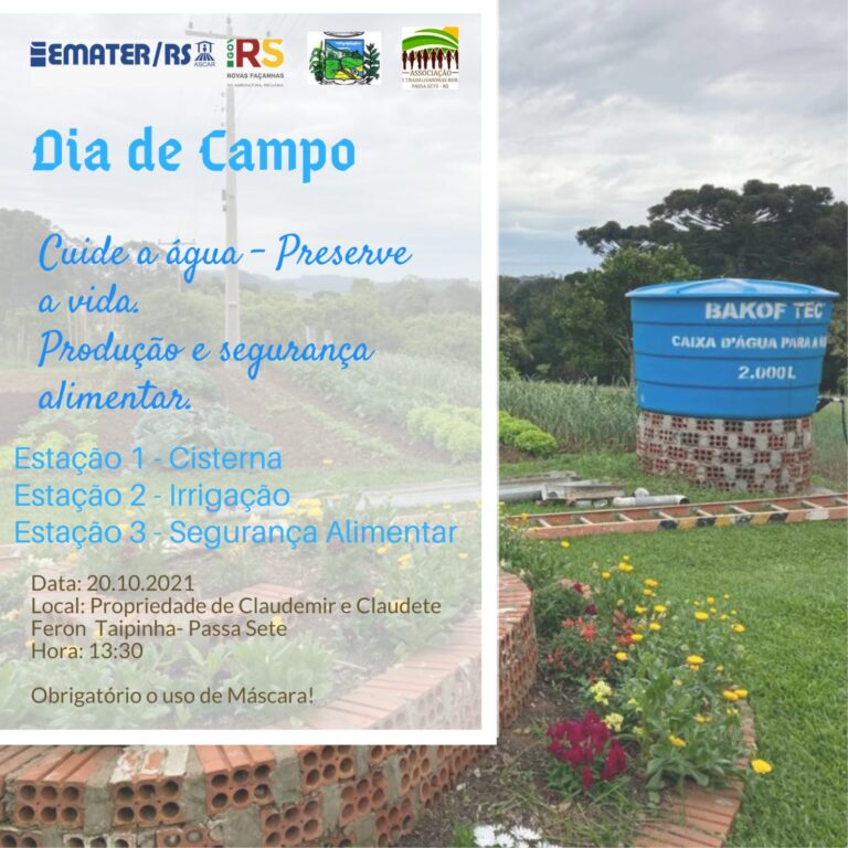 A Emater/RS-Ascar, em parceria com a Associação das Trabalhadoras Rurais e Prefeitura de Passa Sete vai promover, nesta quarta-feira (20), mais uma Tarde de Campo na propriedade de Cláudio e Claudete Feron, em Taipinha. De acordo com a extensionista e chefe da Emater de Passa Sete, Marly Todendi, o evento terá como tema: “Cuide a Água – Preserve a Vida, Produção e Segurança Alimentar”.