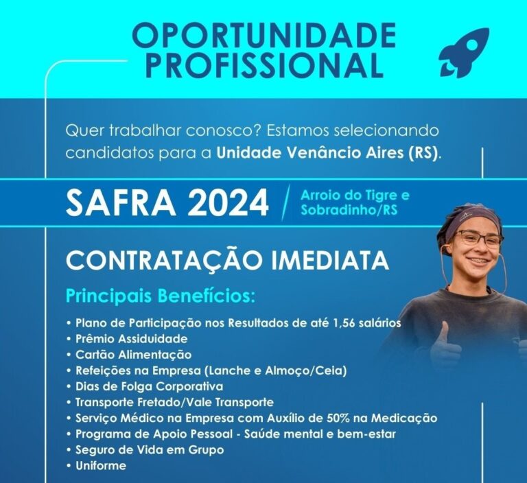A Alliance One, empresa multinacional do ramo do tabaco – Unidade Venâncio Aires, está selecionando candidatos para trabalhar na safra 2024. A empresa oferece como principais benefícios adicionais: Plano de Participação nos Resultados de até 1,56 salários; Prêmio Assiduidade; Cartão Alimentação; refeições na empresa (Lanche e Almoço/Ceia); dias de folga corporativa; transporte fretado/Vale-transporte; Serviço Médico na empresa com auxílio de 50% na medicação; Seguro de Vida em grupo; uniforme.