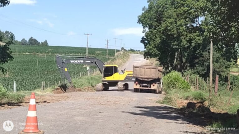 Após longa espera, reiniciaram nessa segunda-feira, 19, as obras para asfaltamento da ERS-347. Uma escavadeira hidráulica e um caminhão fazem a limpeza das margens da estrada.