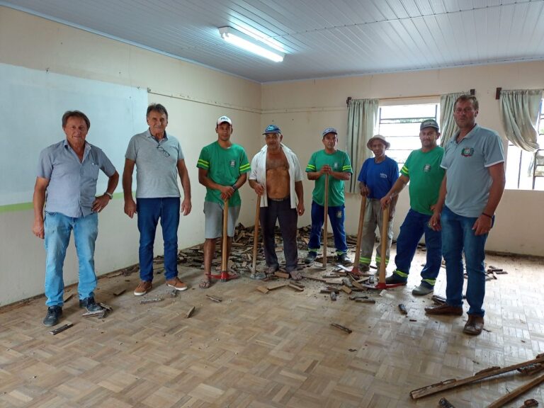 Na tarde de sexta-feira, 13, o Prefeito Valmor Mattana, acompanhou os Servidores Municipais da Secretaria de Obras na remoção do ”parquet” na Escola Luiz Augusto Collombelli.