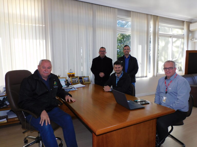 O prefeito Armando Mayerhofer; o secretário de Administração, Dilamar Silva, e o secretário da Indústria, Comércio e Serviços, Darlan Kittel, estiveram reunidos com o consultor de negócios da RGE, Eduardo Doring, e com engenheiro da RGE, Lucas Dornelles.