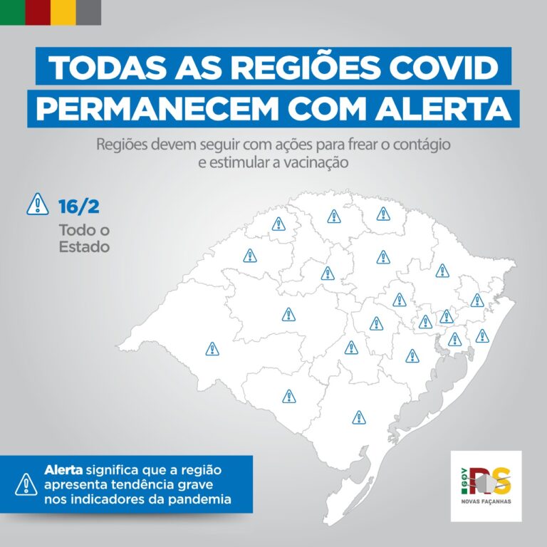 Pela quarta semana consecutiva o Gabinete de Crise decidiu, nesta quarta-feira (16), manter os Alertas para todas as regiões Covid do Sistema 3As de Monitoramento, responsável pelo gerenciamento da pandemia no Rio Grande do Sul. De acordo com o grupo técnico, a justificativa pela manutenção dos Alertas é a conjuntura estadual. Algumas regiões, segundo avaliação do Gabinete de Crise, seguem apresentando crescimento de casos, ocupação em leitos clínicos e de UTIs e também de óbitos. Mesmo que outras regiões apresentem estabilização ou queda nesses números, os patamares são considerados muito altos e podem, facilmente, voltar a crescer. A análise também considerou a expectativa de aumento de circulação de pessoas, nas próximas semanas, provocado tanto pelo gradual retorno às atividades após as férias, como pelo retorno das aulas e pelo Carnaval.